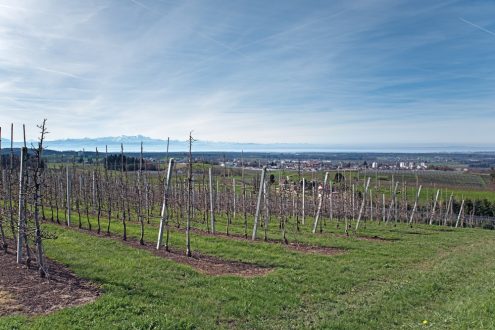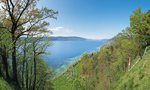 Für diese Etappe sollte ausreichend Zeit eingeplant werden, denn sie ist landschaftlich sehr reizvoll! Stockach ist schnell durchschritten. Dahinter wartet ein Wechsel aus weiten Fluren und stillen Wäldern. Unter der Kuppe des Sipplinger Berges steht der Haldenhof. Das Höhengasthaus befindet sich auf halber Strecke. Auch Gästezimmer sind im Angebot, sodass die Etappe hier geteilt werden kann. Von seinem Aussichtspunkt darf zum ersten Mal auf den Bodensee geblickt werden. Der Weg folgt anschließend der Hangkante. Immer wieder werden herrliche Ausblicke frei. Eine jähe Schlucht, der Hödinger Tobel leitet in die namensgebende Ortschaft. Hinter ihr beginnt der Abstieg an den Seegürtel. Die Besiedlung am Ufer ist merklich dichter als in den ländlichen Gebieten um Stockach. Dafür wartet das Ziel mit beinahe mediterranem Charme auf. Überlingen besitzt eine schöne Seepromenade und eine hübsche Altstadt. Gastronomie und Gästezimmer sind reichlich vorhanden.