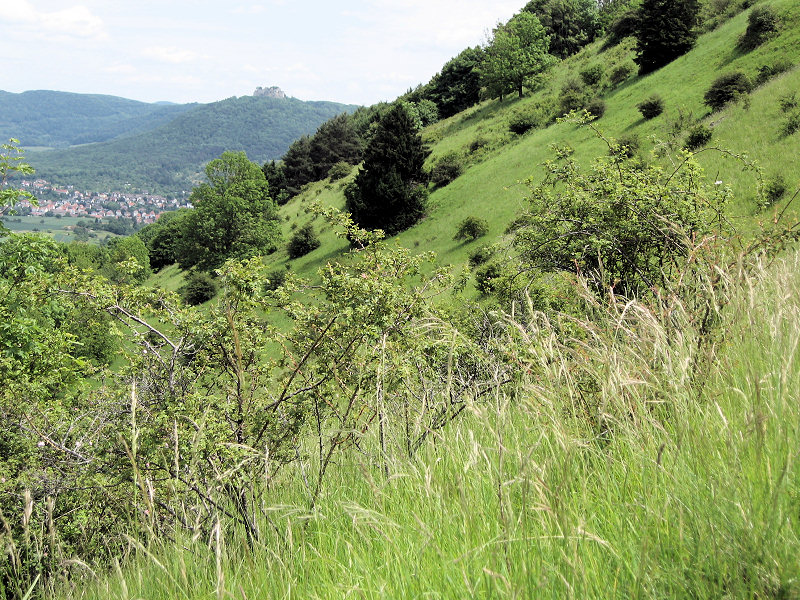Blick über die Schichtstufenlandschaft. Kohlberg liegt auf einer Terrasse, die von den abtragungsresistenten Blaukalken des Mitteljuras gebildet wird.