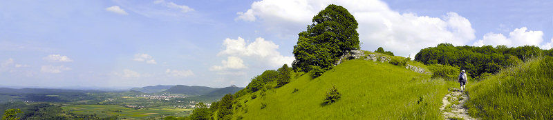 Der Sporn des Jusis bietet eine fantastische Rundumsicht. Auffallend ist die Steilstufe der Schwäbischen Alb, aber auch im Albvorland ist das Relief bewegt. Stufen und Flächen sind auszumachen. Wir befinden uns in einer Schichtstufenlandschaft.