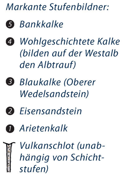 Durch die unterschiedliche Widerstandsfähigkeit der Gesteine gegenüber der Erosion werden „harte“ Gesteinsschichten (Kalkstein, Sandstein) als Stufen herausmodelliert. Dies sind die Stufenbildner. „Weiche“ Gesteine (Tonsteine, Mergel) zerfallen schneller und sind leichter erodierbar. Sie bilden die Hänge und Sockel unterhalb der Steilstufen.