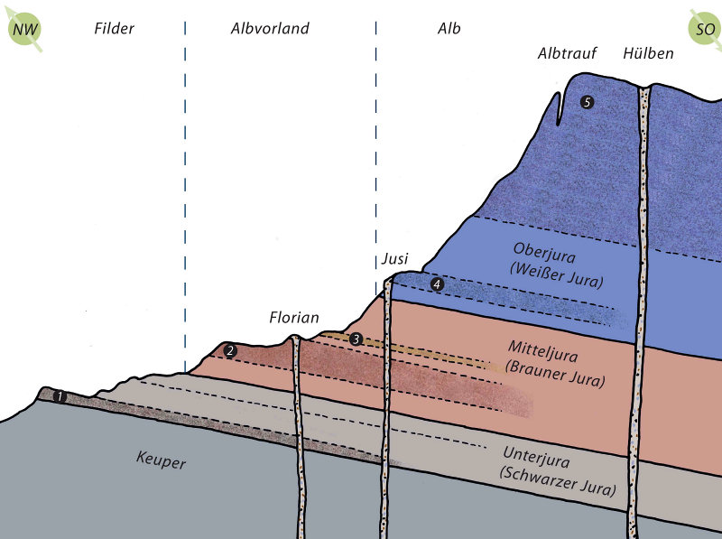 Der Bau einer Landschaft bestimmt, wie die Menschen leben und wirtschaften, wo sie Siedlungen und Straßen anlegen, welche landwirtschaftliche Nutzung möglich und wo Wald ist. Die markante Schichtstufe der Schwäbischen Alb hat viele Folgen: Der Steilabfall ist eine verkehrstechnische Hürde, er ist fast überall bewaldet, und er lockt Wanderer mit fantastischen Aussichtpunkten – so wie hier am Jusi.