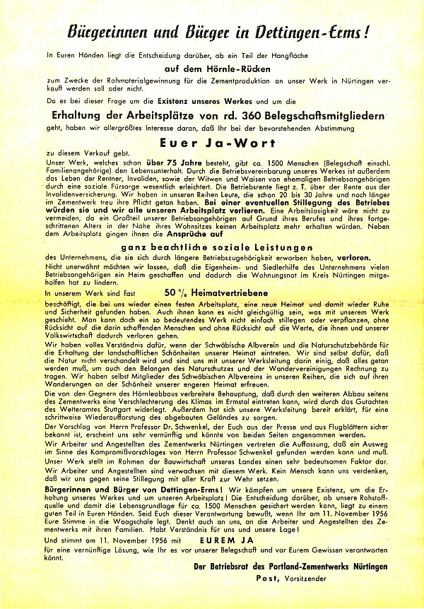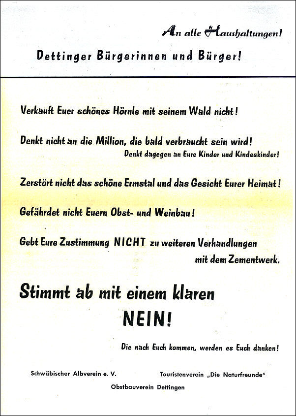 Bei einer Bürgerbefragung 1956 in Dettingen – einer der ersten in der Geschichte der jungen Bundesrepublik – stimmten 72 Prozent gegen weitere Verkaufsverhandlungen mit dem Zementwerk und der Gemeinderat schloss sich diesem Votum an. Das Hörnle war damit gerettet.