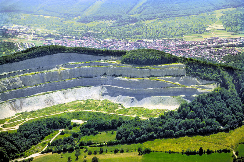 Der Steinbruch „Neuffener Hörnle“ im Jahr 1983, hinten das Ermstal mit Dettingen.