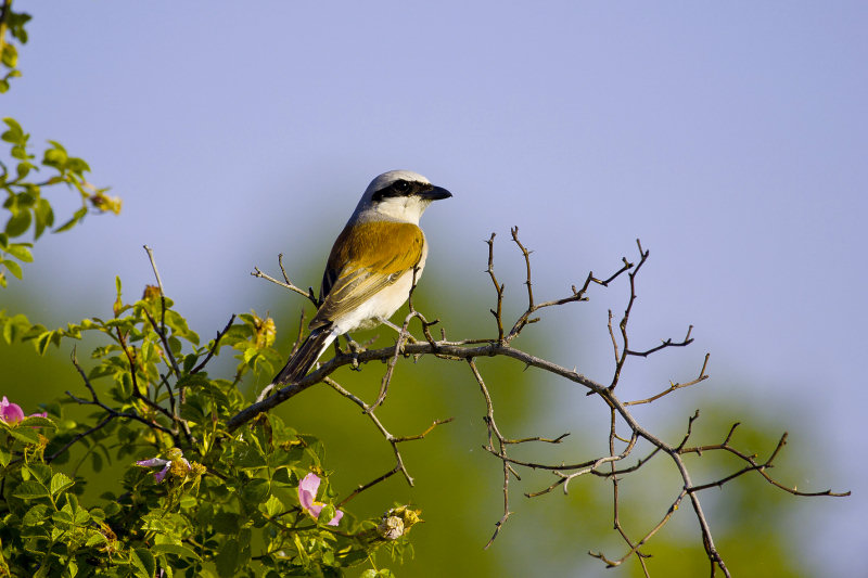 Der Neuntöter ernährt sich von Insekten. Was er nicht gleich frisst, spießt er in den Hecken als Vorrat auf Stacheln und Dornen auf.