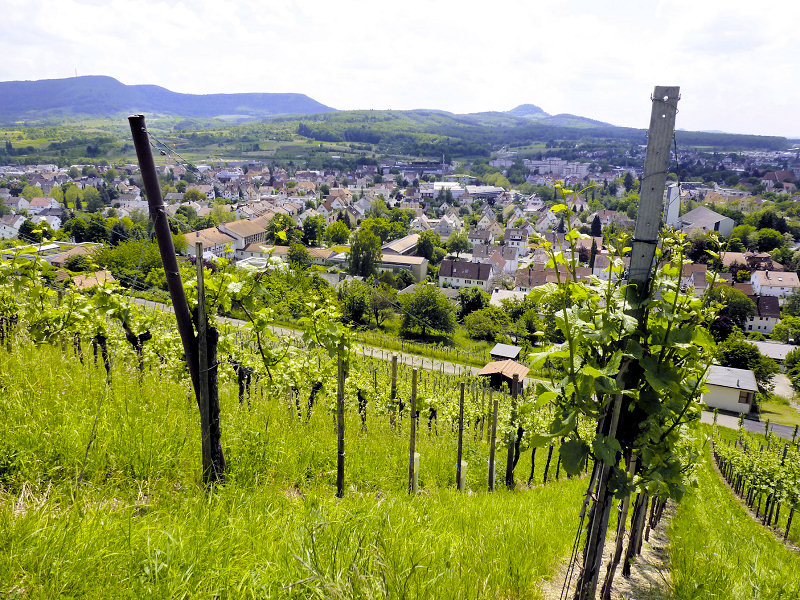 Blick zur Achalm (rechts), die einst mit der Alb zusammenhing. Vorne und in der Mitte die Mitteljura-Landschaft um Metzingen.