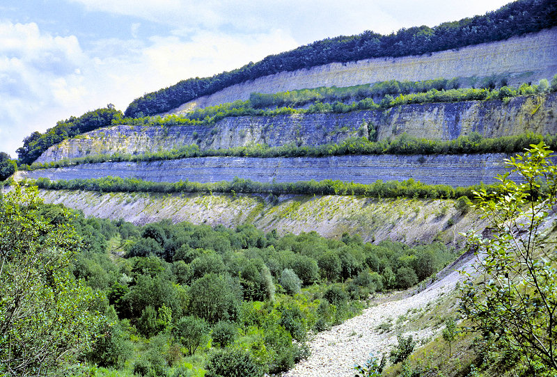 Schichtenfolge des Oberjuras (Weißjura α-δ) im aufgelassenen Steinbruch Hörnle, Neuffen.