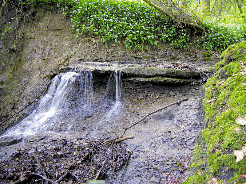 Mitteljura: überwiegend tonige Gesteine mit einzelnen härteren Schichten (Braunjura α, Opalinuston mit Wasserfallschichten, Stauferbachtobel, Metzingen).